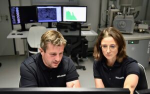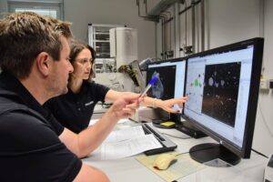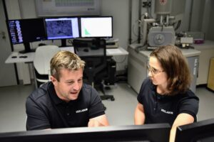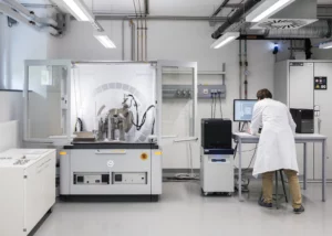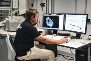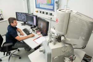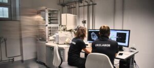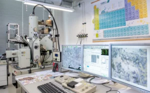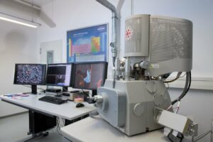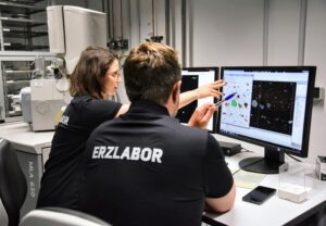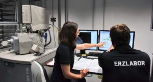 Description: Ein modernes Rasterelektronenmikroskop (REM) im Analyselabor von ERZLABOR, das für die präzise Materialcharakterisierung eingesetzt wird. Rechts im Bild steht das hochwertige Elektronenmikroskop mit seiner charakteristischen Gerätekammer und angeschlossener Steuerungseinheit. Links befindet sich ein Arbeitsplatz mit drei Monitoren, die verschiedene Visualisierungen der Mikroskopie zeigen: mikroskopische Strukturaufnahmen, Elementverteilungen und Analysedaten. An der Wand hängt ein Periodensystem der Elemente, das den wissenschaftlichen Kontext unterstreicht. Diese fortschrittliche Technologie ermöglicht ERZLABOR die detaillierte Untersuchung und Charakterisierung komplexer Materialproben auf mikroskopischer Ebene für die Ressourcenanalytik.