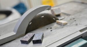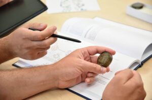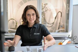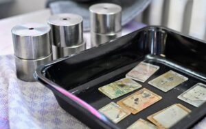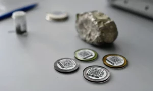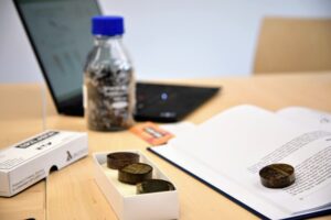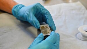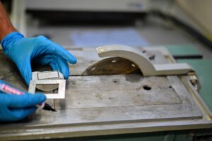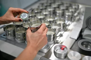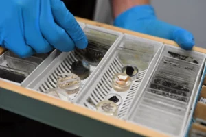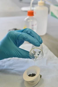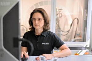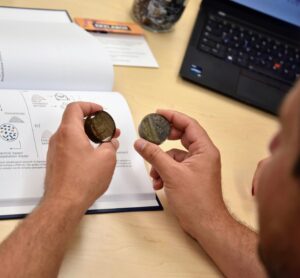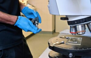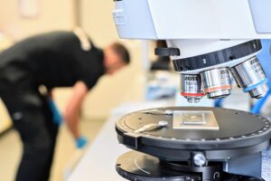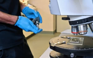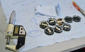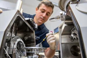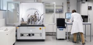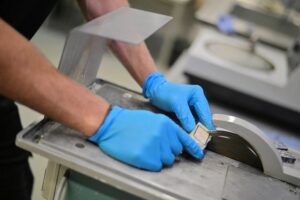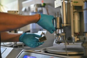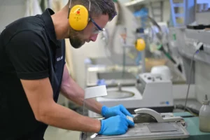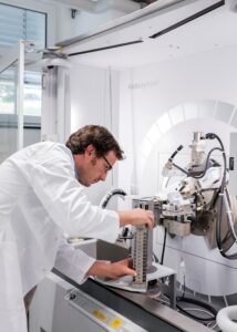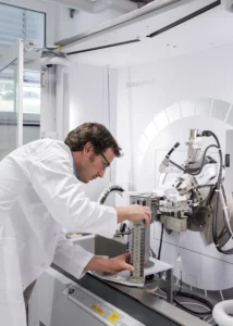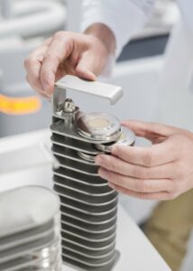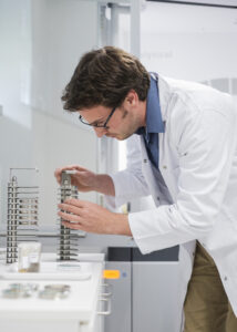 Description: Ein konzentrierter Labormitarbeiter in weißem Kittel und blauem Hemd justiert sorgfältig eine Reihe von metallischen Proben oder Prüfkörpern, die auf einem Laborgerät angeordnet sind. Die präzise Handhabung der gestapelten Scheibenproben spiegelt die Sorgfalt und Genauigkeit wider, die für die Materialcharakterisierung bei ERZLABOR charakteristisch ist. Im Hintergrund ist eine moderne, klinisch saubere Laborumgebung zu erkennen, die auf hochwertige wissenschaftliche Analyse hinweist.