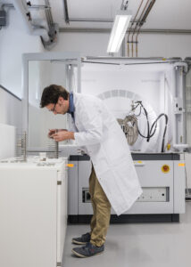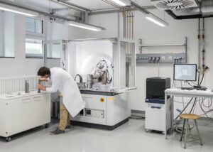 Description: In einem klinisch sauberen, hochmodernen Laborraum von ERZLABOR arbeitet ein Wissenschaftler im weißen Laborkittel konzentriert an der Vorbereitung einer Probe für ein Röntgendiffraktometer (XRD). Das Präzisionsgerät ist in einer geschützten Messkammer untergebracht und wird zur detaillierten Materialcharakterisierung eingesetzt. Rechts im Bild ist die zugehörige Computerstation mit Monitor zur Steuerung und Datenauswertung zu sehen. Im linken Bereich des Labors befindet sich ein Probenpräparationsbereich. Die technische Infrastruktur mit sichtbaren Versorgungsleitungen an der Decke unterstreicht die professionelle Laborumgebung, die für die anspruchsvolle Ressourcenanalytik optimiert ist.