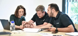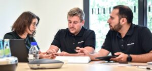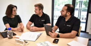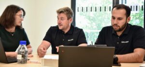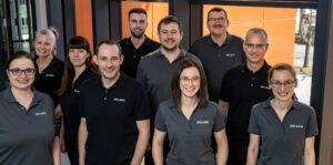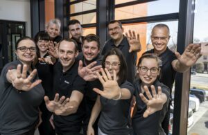 Description: Das dynamische Team von ERZLABOR präsentiert sich auf lockere und einladende Weise vor dem Eingang ihres Bürogebäudes. Die zehn Mitarbeiterinnen und Mitarbeiter tragen einheitliche dunkle Polo-Shirts mit Firmenlogo und strecken gemeinsam ihre Hände in Richtung Kamera, was Offenheit und Kundenorientierung symbolisiert. Die freundlichen Gesichtsausdrücke und die aktive Pose vermitteln Zugänglichkeit und Teamgeist. Im Hintergrund sind die großen Glasfenster des modernen Firmengebäudes mit charakteristischen orangefarbenen Elementen zu sehen, die das professionelle Umfeld des Unternehmens unterstreichen.