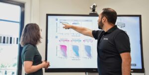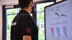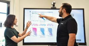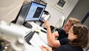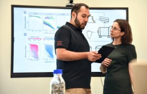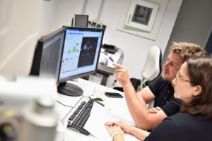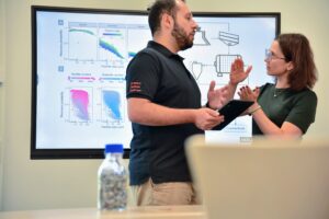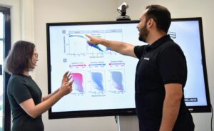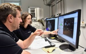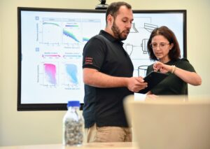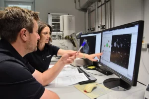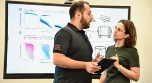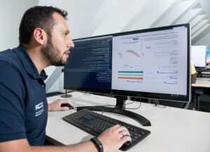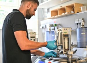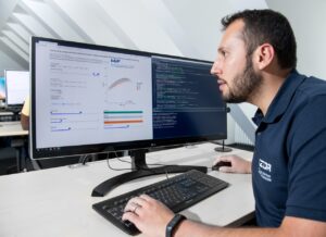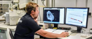 Description: Ein Mitarbeiter im dunkelblauen Polo-Shirt analysiert konzentriert Daten an einem Computerbildschirm. Auf dem Monitor ist links eine Anwendung zur Berechnung von Partikelrotationskinetik mit Diagrammen und Einstellungsparametern zu sehen, während auf der rechten Seite weitere Analysedaten angezeigt werden. Der Mann arbeitet in einem modernen Büroumfeld an der detaillierten Auswertung komplexer Materialdaten, was die fortschrittliche digitale Auswertungskompetenz im Bereich der Ressourcenanalytik verdeutlicht.