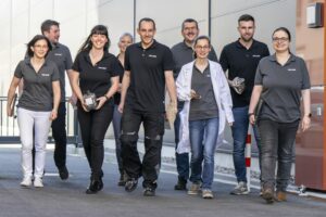 Description: Das dynamische Team von ERZLABOR schreitet gemeinsam vor dem Firmengebäude. Die acht Mitarbeiterinnen und Mitarbeiter tragen einheitliche dunkle Polo-Shirts mit dem ERZLABOR-Logo und repräsentieren die verschiedenen Fachbereiche des Unternehmens. Mehrere Teammitglieder halten Gesteins- oder Materialproben in den Händen, was den praktischen Bezug zur Ressourcenanalytik unterstreicht. Eine Wissenschaftlerin in der Bildmitte trägt zusätzlich einen weißen Laborkittel. Die Gruppe strahlt Professionalität, Teamgeist und Expertise im Bereich der Materialcharakterisierung aus.